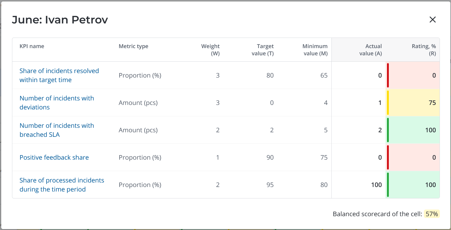 - Balanced scorecard of the cell, which is calculated based on all values of the specified KPIs by the formula.