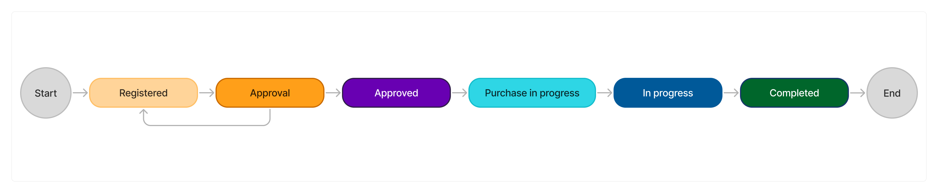 | Registered | A new purchase request record enters the state after saving. An existing record in the Approval state becomes Registered if an approver rejects the request. |