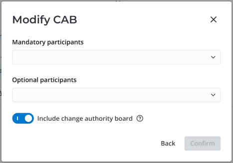 - (optional) Deactivate the Include change authority board toggle if you need the CAB for this request to consist only of the users you selected in the modal window. If you leave the toggle activated, the selected users will be added to the existing CAB for the current request.
