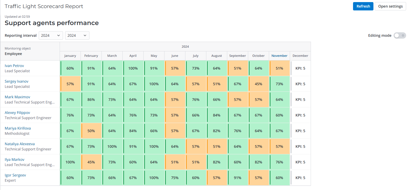 The Open report button is available on a created traffic light scorecard form. Click it to open the report page with a table of monitoring objects and KPI settings for them.