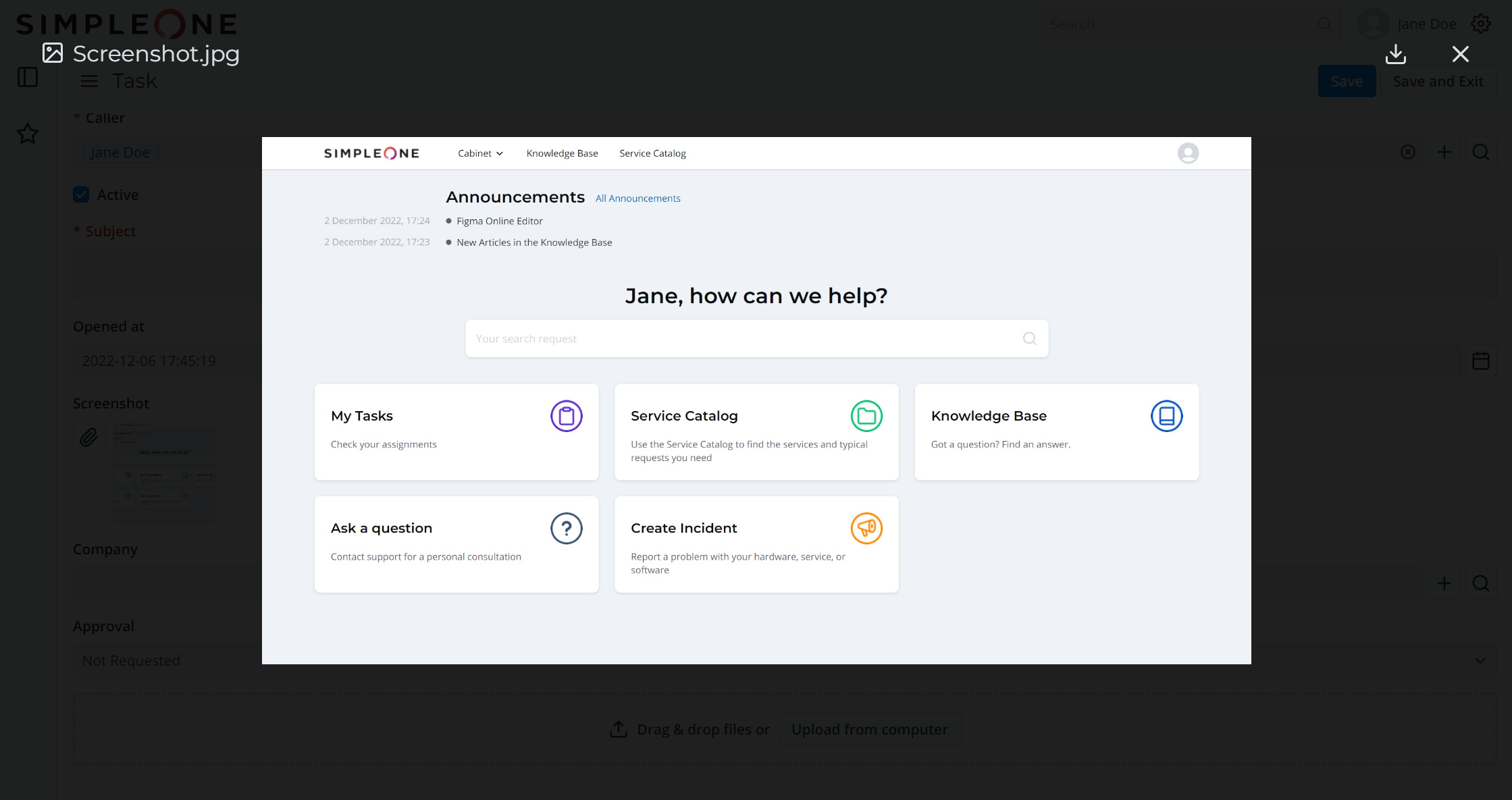 SimpleOne supports attaching files to existing or newly created records. You can attach files to a record directly, use the attachment window or an image field. This article describes how to use these interface elements to add and manage attachments.
