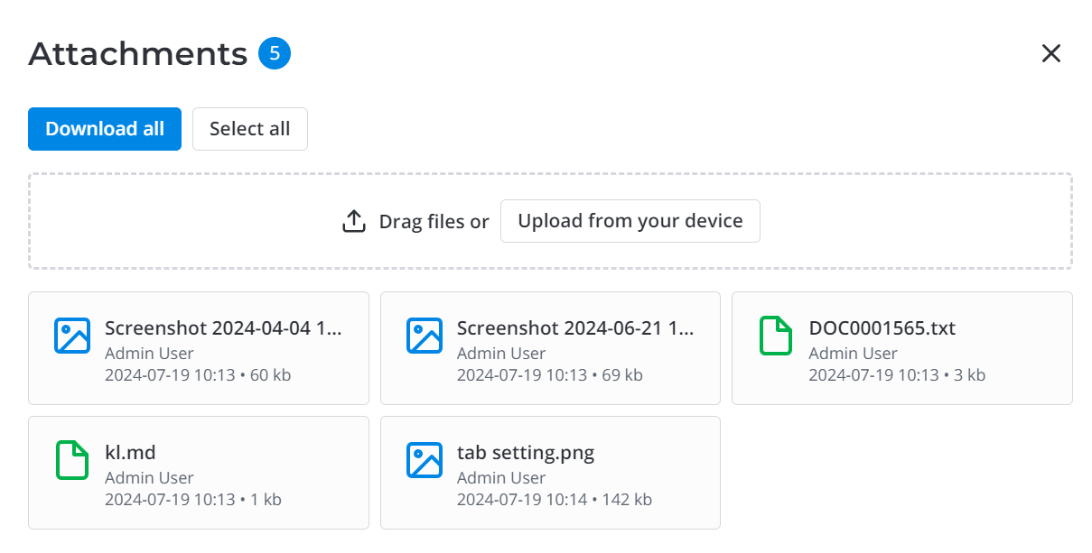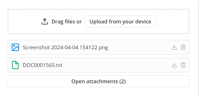 Some records may have an attachment area. You can use this area to upload and manage attachments without leaving the record, or click Upload from your device to open the attachment window. Note that if a record has an attachment area, the paper clip icon not displayed.