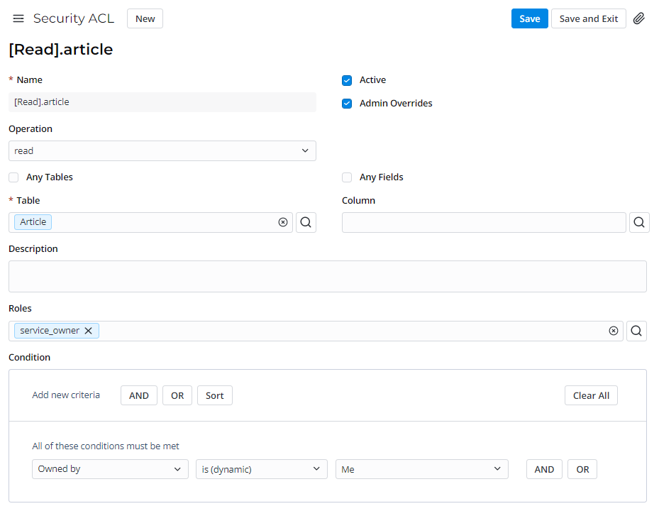 | Roles | Required role: service_owner | Only users with the service_owner role can read articles. |
