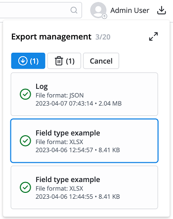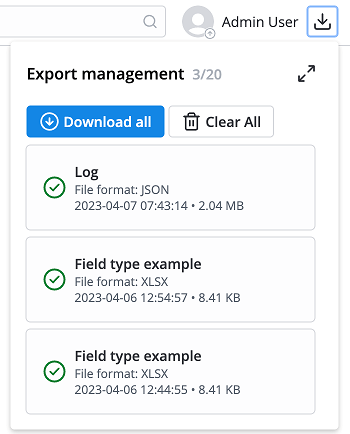 To call the Export management widget, click the icon at the top of the page next to the profile settings. Use the button to expand the widget to easier navigate through the files and select the necessary ones for downloading or removing.