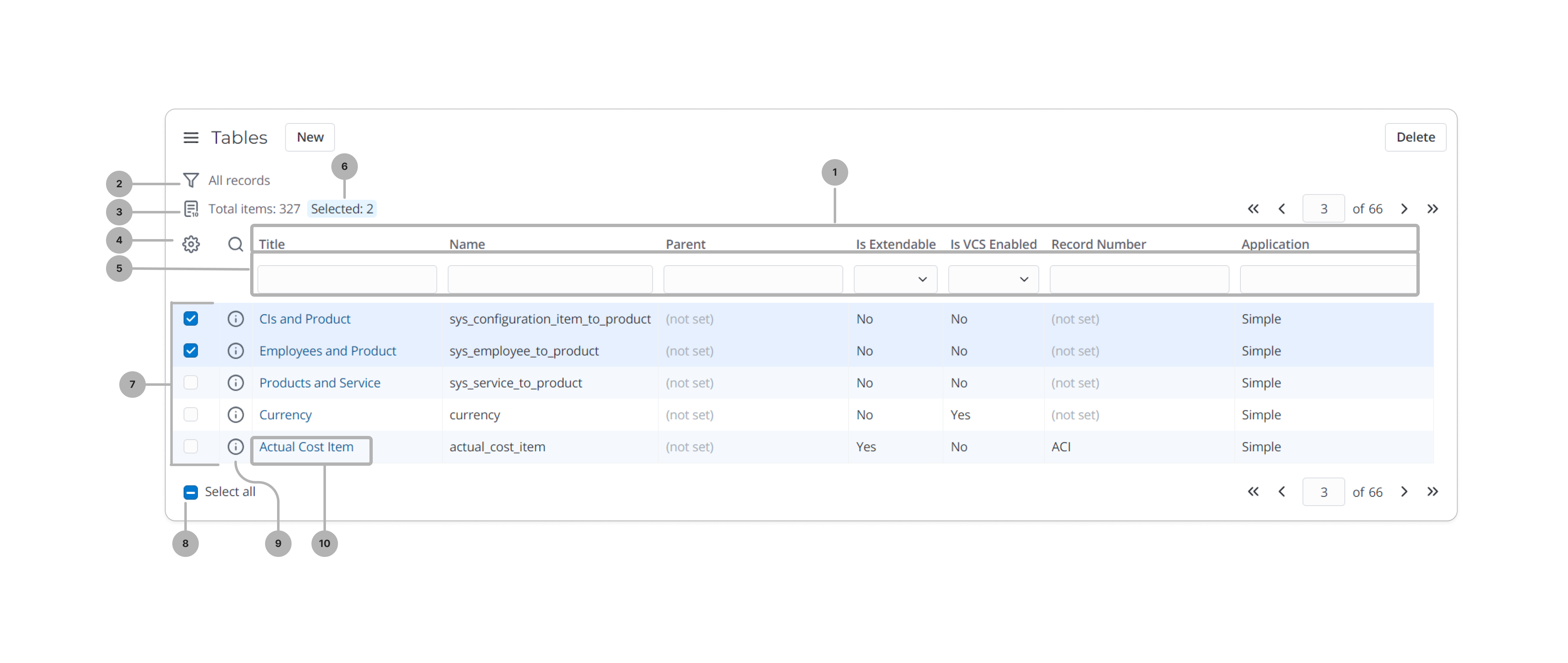 - List of records – records included in the table displayed in rows. You can select records using the checkboxes on the left to delete them or select them for the List type field. By default, the records in lists are sorted by the ID column in descending order.
