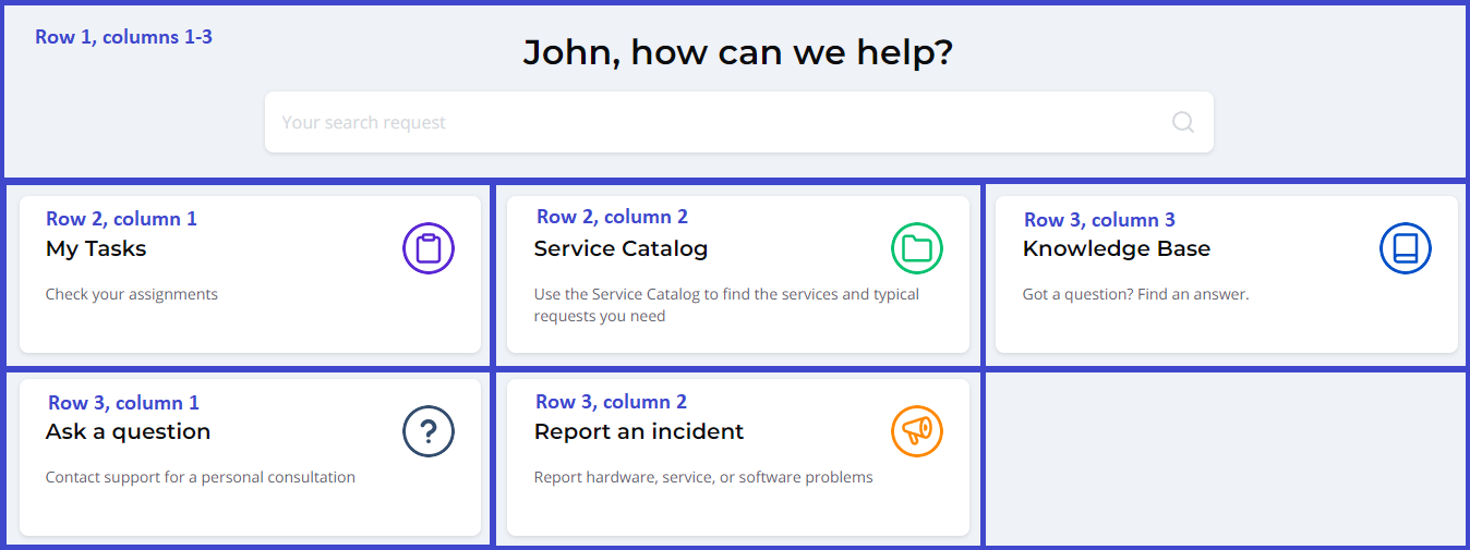 Service Portal pages are the entities used to structure the content. A page consists of containers and rows, which, in turn, consist of columns. Manage page layouts to reach the best user experience. For more information about portal structure, refer to the Page Structure and Portal Integration articles.