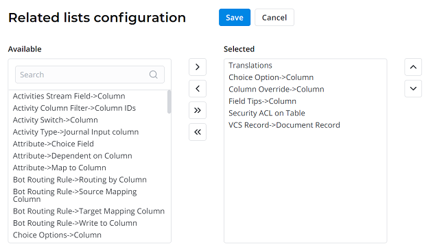 Related lists appear at the bottom of forms and display records from the tables related to the current record. For example, a Table (sys_db_table) record contains the Column related list. It displays records from the Column (sys_db_column) table related to the current record.