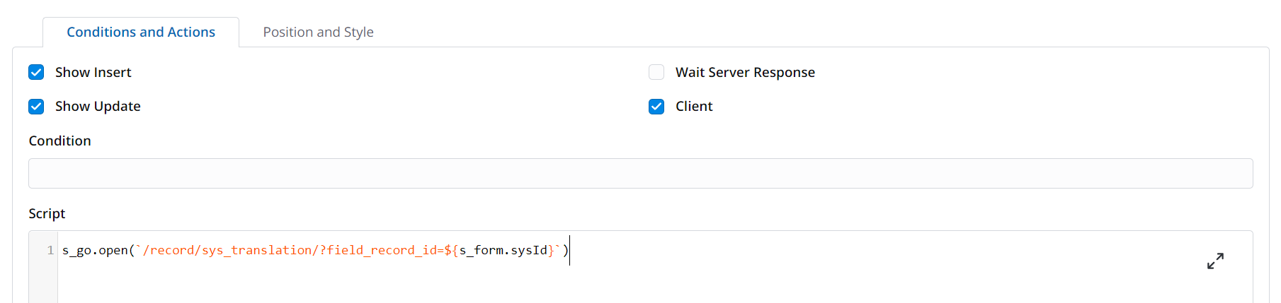 | Condition | N | Specify the trigger conditions to run the client script. Use the condition builder to build complex AND/OR filters.