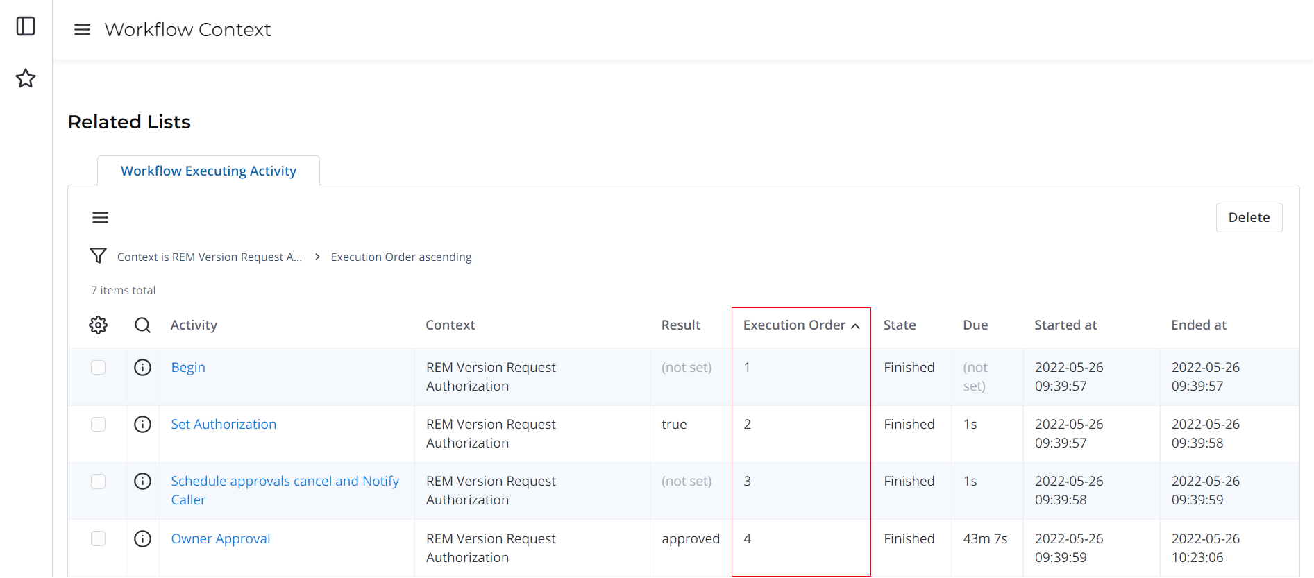 The context form also contains the Workflow Executing Activity related list. The order in which the context activities are executed is specified in the Execution order column.