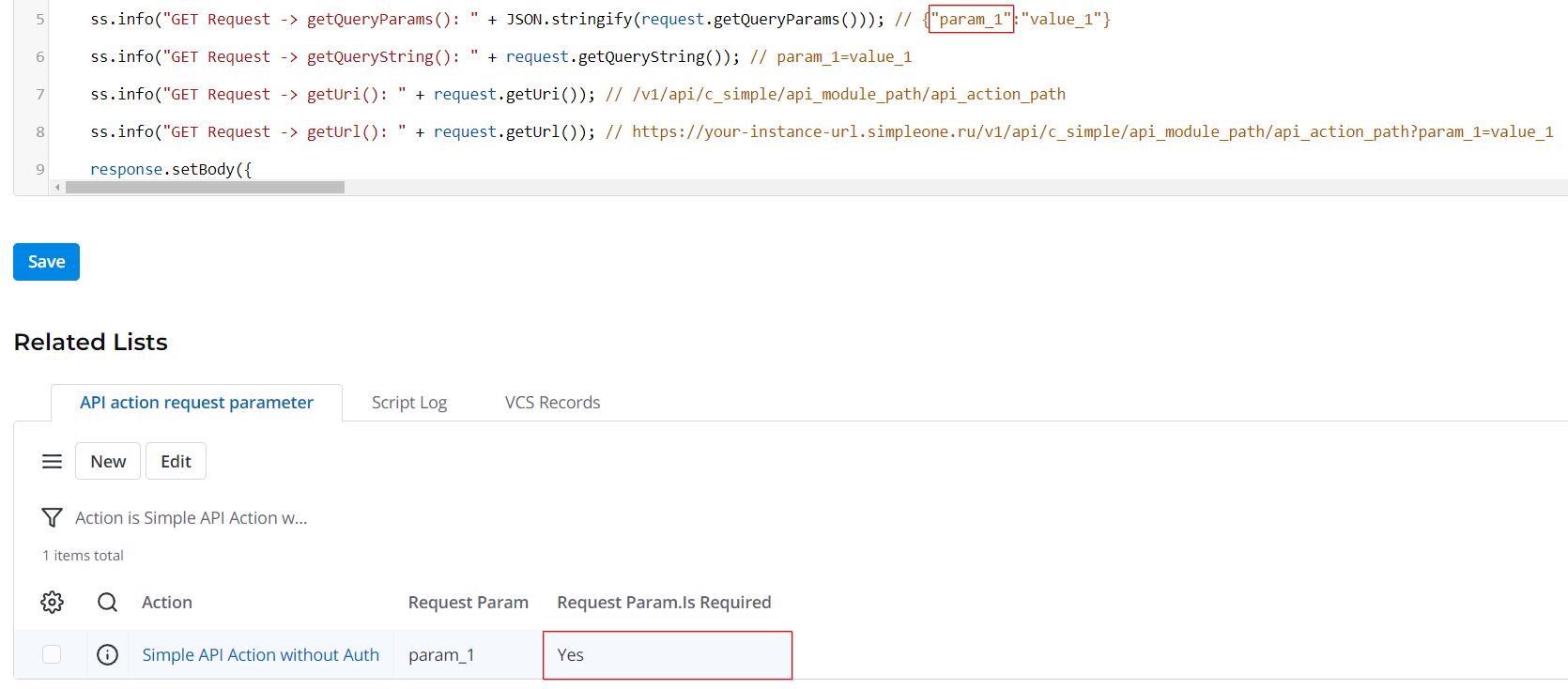 In the Script filed, add a script to call when a REST request for the action occurs. To work with the REST API requests in the SimpleOne platform, the SimpleRestRequest and SimpleRestResponse classes are defined. The data objects of these classes are available in the API action script. See the example below: