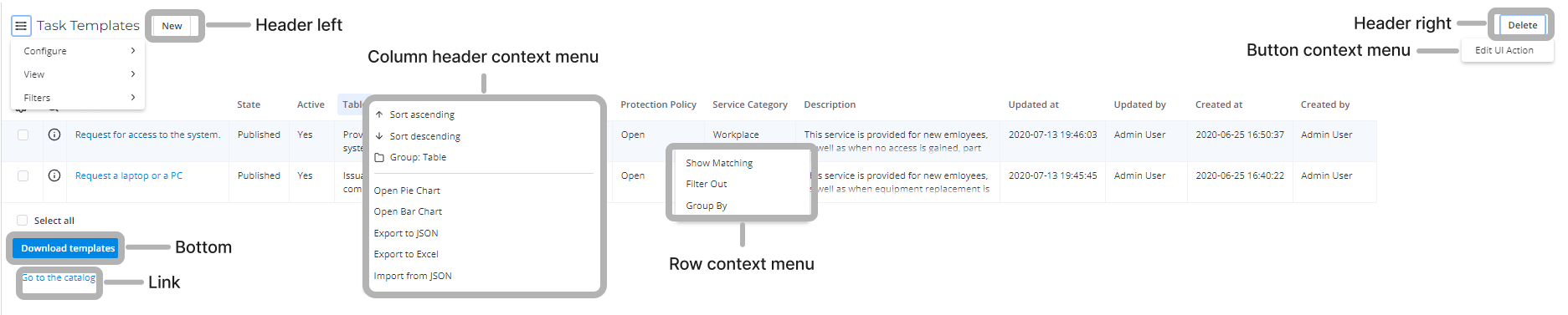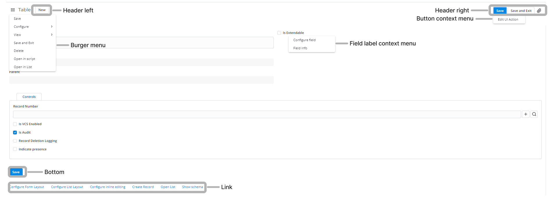 User interface (UI) actions are buttons, links, and context menu items on forms and lists. They allow you to customize the UI to be more interactive, adjustable, and comfortable for working.