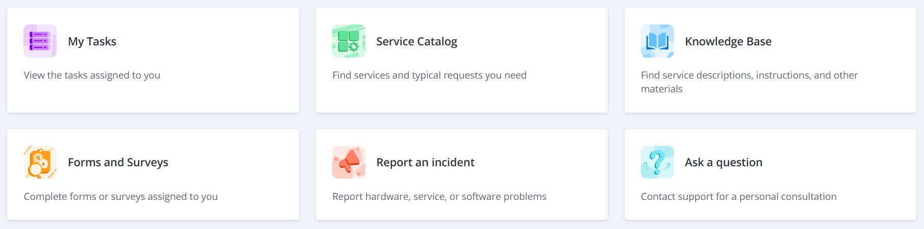 The Self-Service Portal (SSP) offers different ways of interacting with the system. In case you have the ITSM business solution installed, in addition to the ability to track and process your own tasks, the SSP allows you to contact the IT support. Here you can create tickets: incidents, user queries, and service requests.