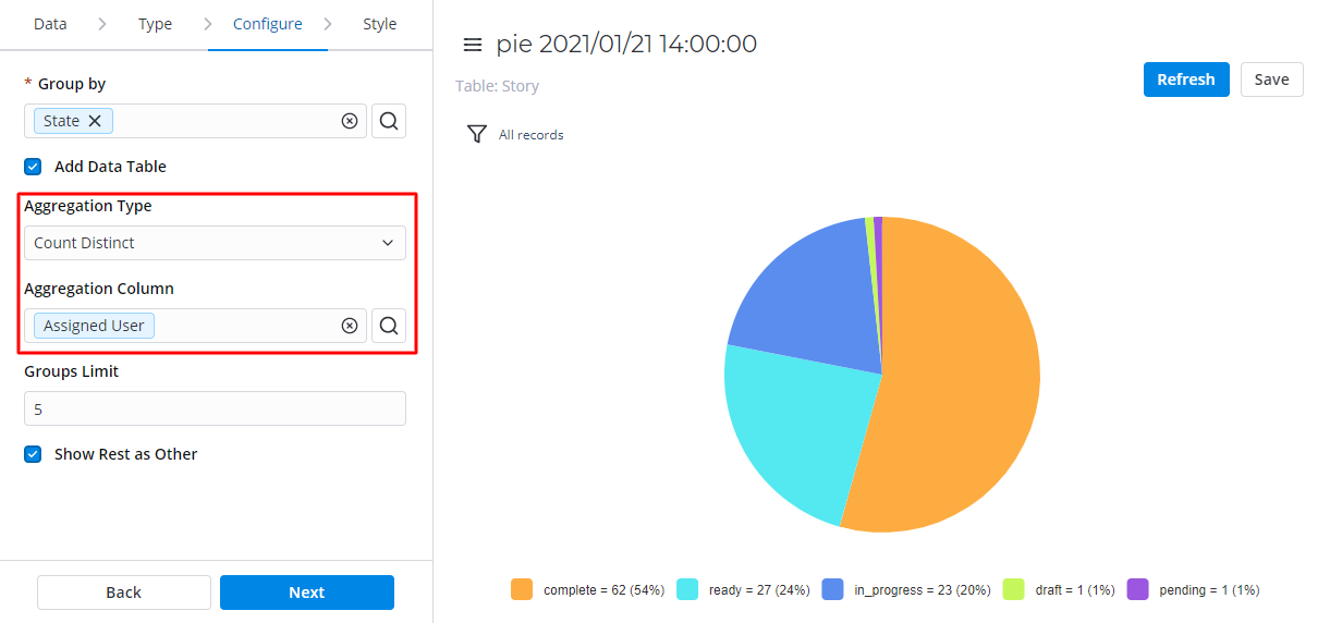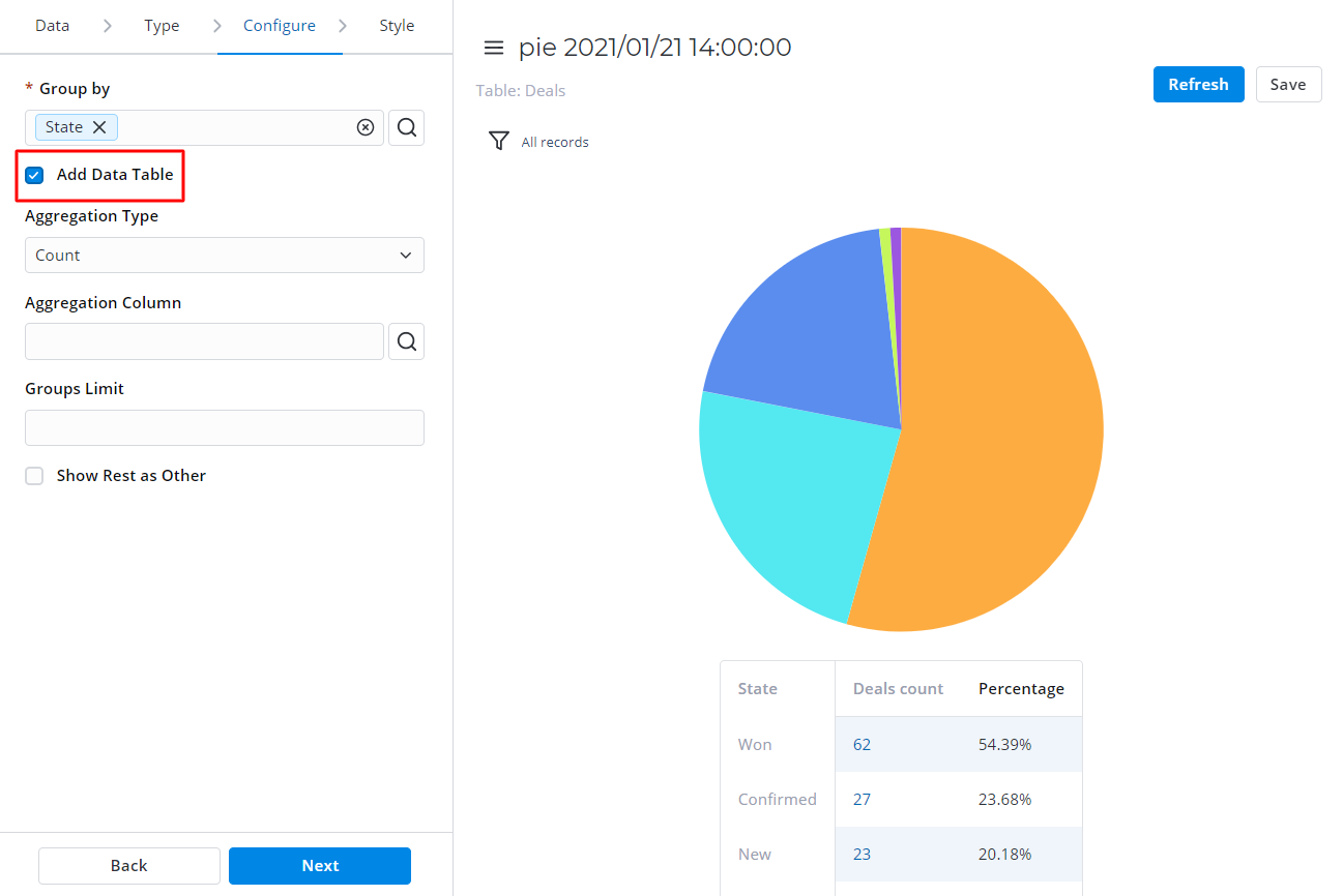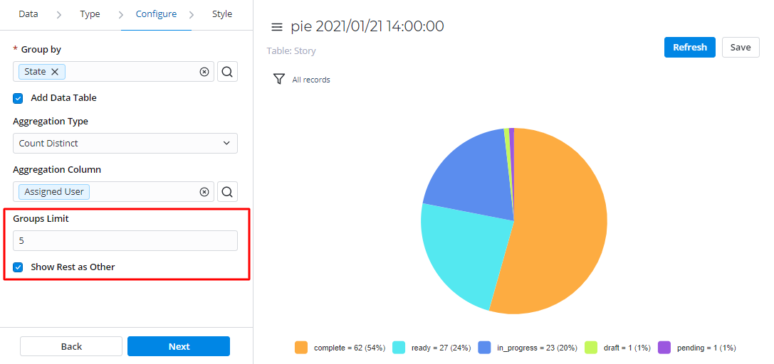 4. (optional) Limit the number of data categories displayed with the Groups limit option. It limits the number of categories specified in the Group by field. Enter the number you want and select the Show rest as Other checkbox to show the categories not included in the limit as the last group.