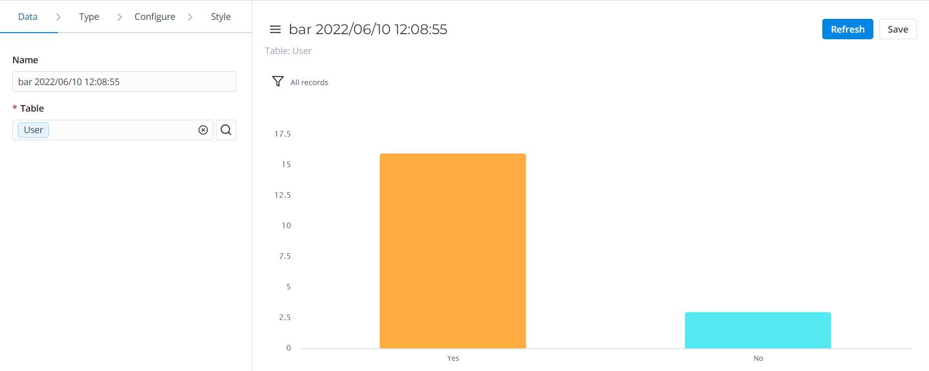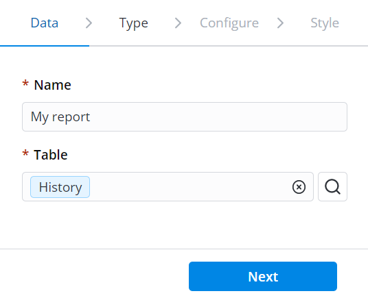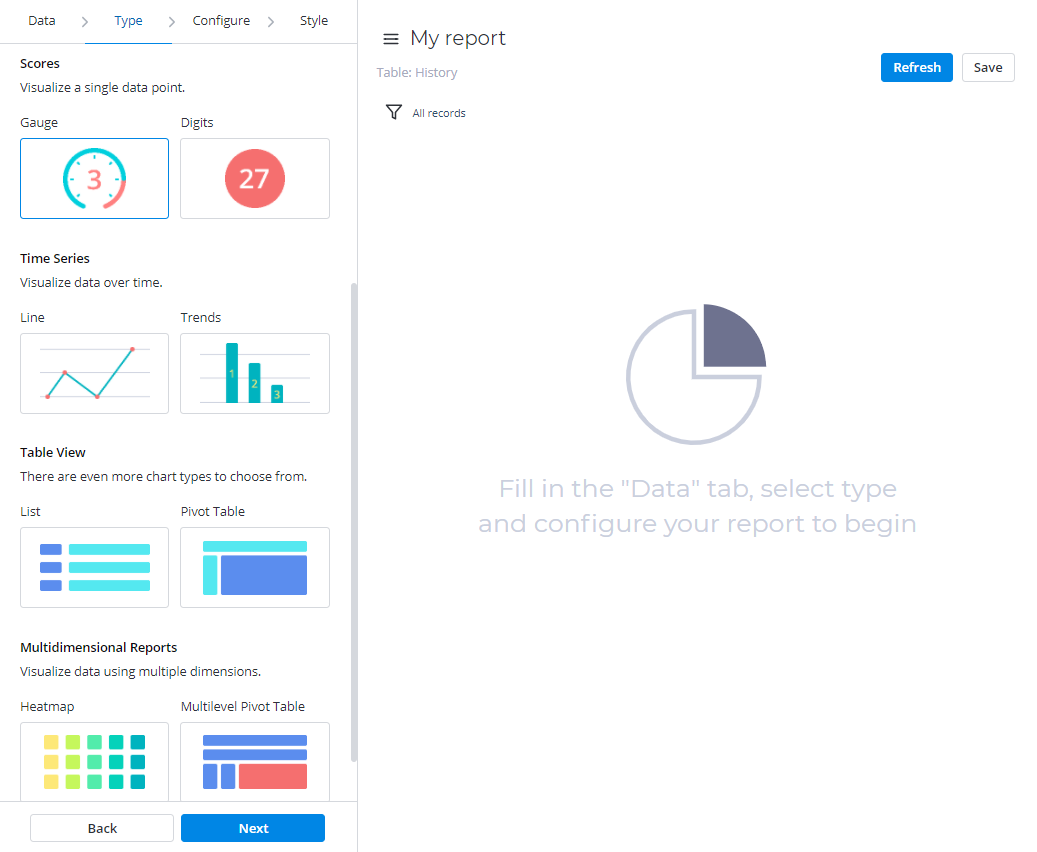 1. On the Configure tab, fill in the fields determined by the report type selected. The reports of the Bars, Pies, Time Series, and Multidimensional category types have mandatory fields.
