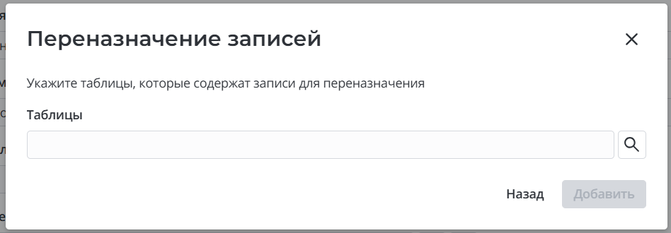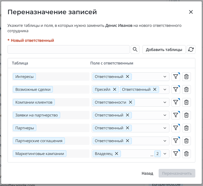 Добавить таблицы – нажмите, чтобы добавить в список ниже новые таблицы, в которых нужно переназначить записи. Если среди указанных таблиц есть расширяемые, переназначение не выполнится автоматически в записях дочерних таблиц. Изменятся только записи тех таблиц, что были непосредственно выбраны в виджете.