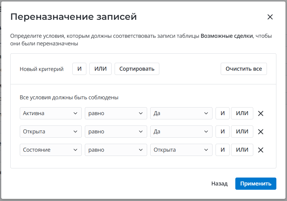 – нажмите, чтобы создать условие для таблицы, записи которой вы хотите переназначить. Это позволит сузить выборку записей, в которых произойдут изменения. Если для таблицы настроены условия, кнопка будет отмечена синим индикатором: