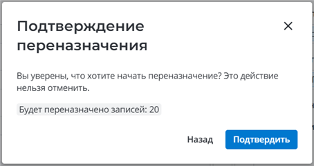 Проверьте количество записей, которые будут переназначены. Если настройка корректна, нажмите Подтвердить, чтобы внести изменения.
