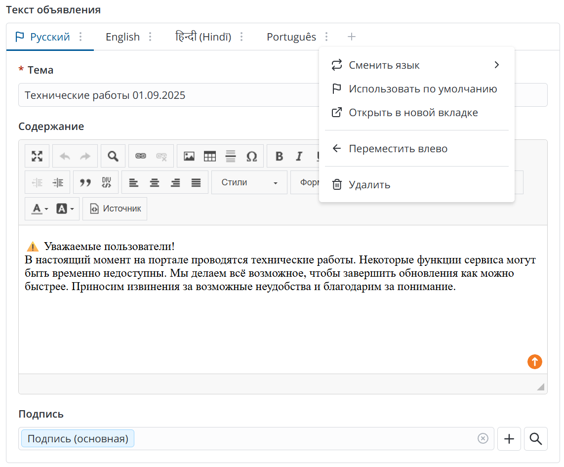 При создании переводов вы можете указать, какой из них использовать по умолчанию. Объявление на этом языке будет отправлено пользователям по электронной почте и доступно на портале, если: