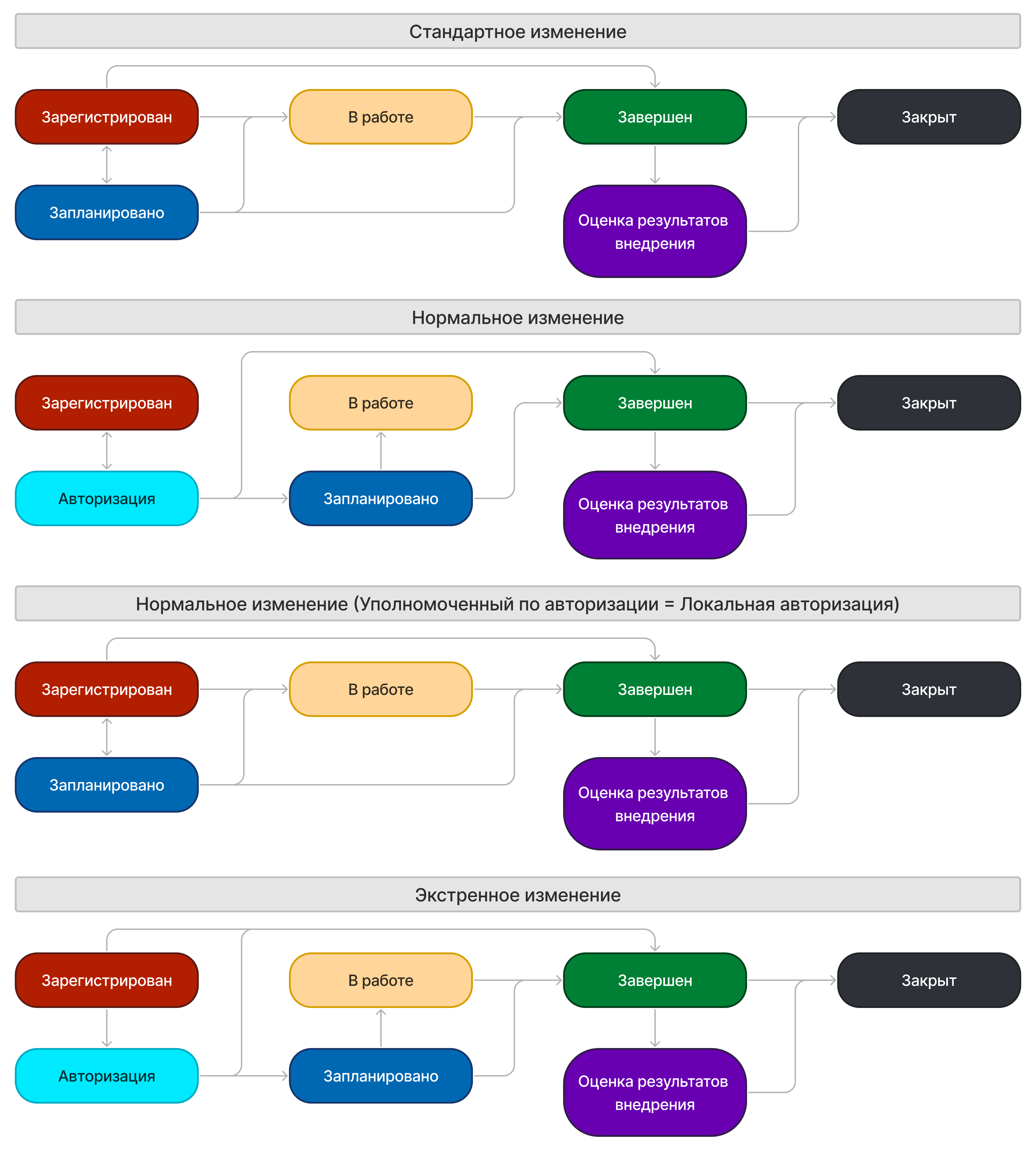 На приведенных ниже схемах показаны статусные модели стандартных, нормальных и экстренных типов запроса на изменение.