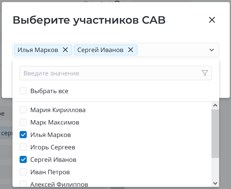 - В открывшемся модальном окне выберите обязательных и необязательных участников согласования. Вы можете выбрать столько участников, сколько необходимо. Вы также можете отменить выбор пользователя, сняв флажок напротив его имени.
