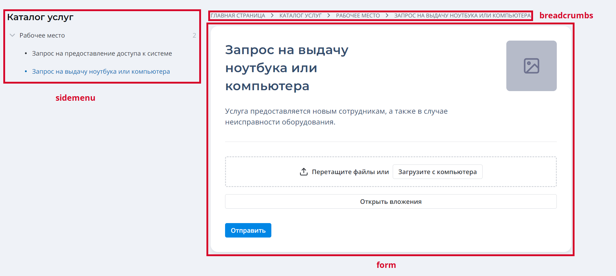 Страница каталога услуг на портале предлагает формы для отправки запросов на обслуживание.
