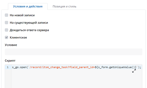 • Условия работают совместно со значениями из поля Тип. Они применяются только к клиентским скриптам типа При загрузке, При отправке формы или При изменении.
