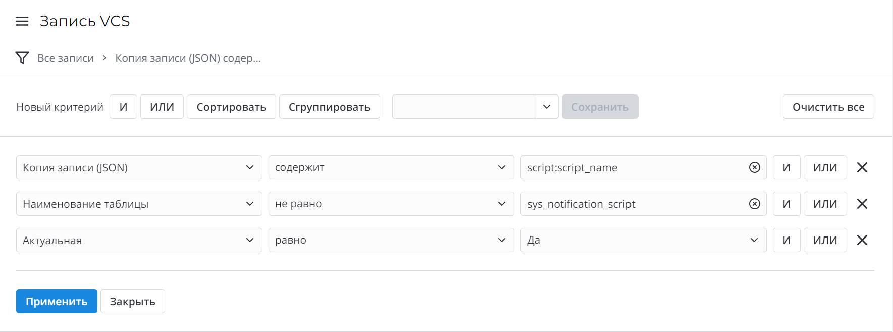 Для того чтобы определить, где используются скрипты уведомлений, при помощи конструктора условий отфильтруйте записи в таблице Записи VCS (sys_vcs_record) по следующим условиям: