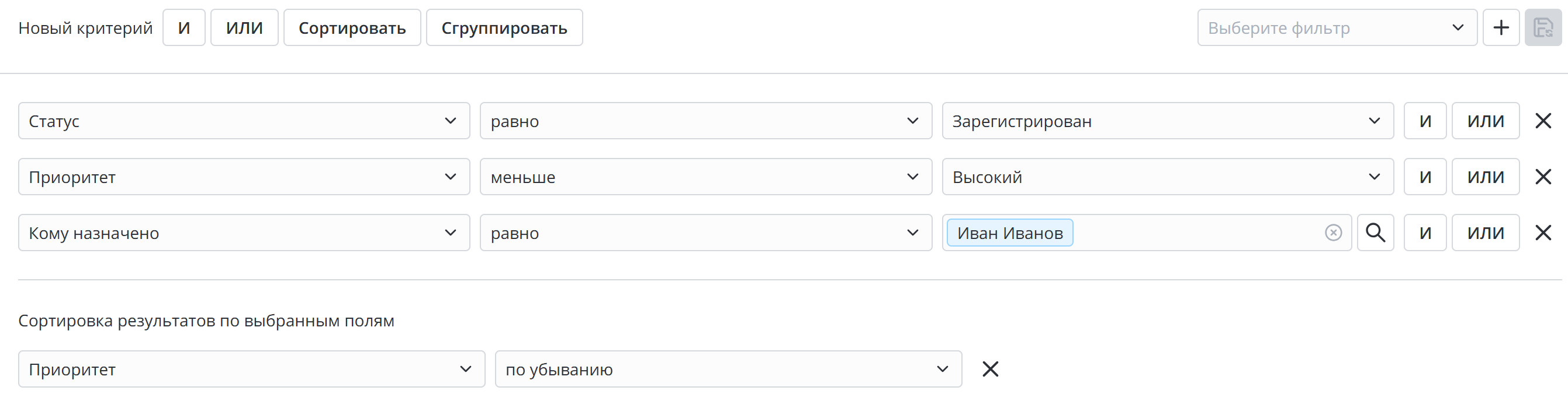 Например, вам нужно найти зарегистрированные запросы Ивана Иванова с приоритетом Средний и Низкий, отсортированные по приоритету.