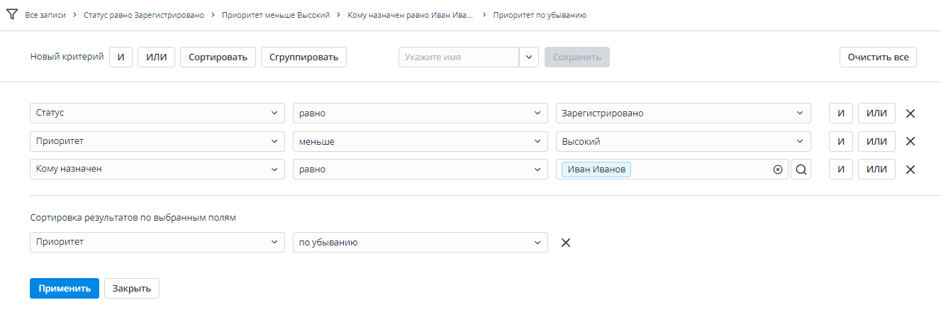 Например, вам нужно найти зарегистрированные запросы Ивана Иванова с приоритетом Средний и Низкий и отсортированные по приоритету.