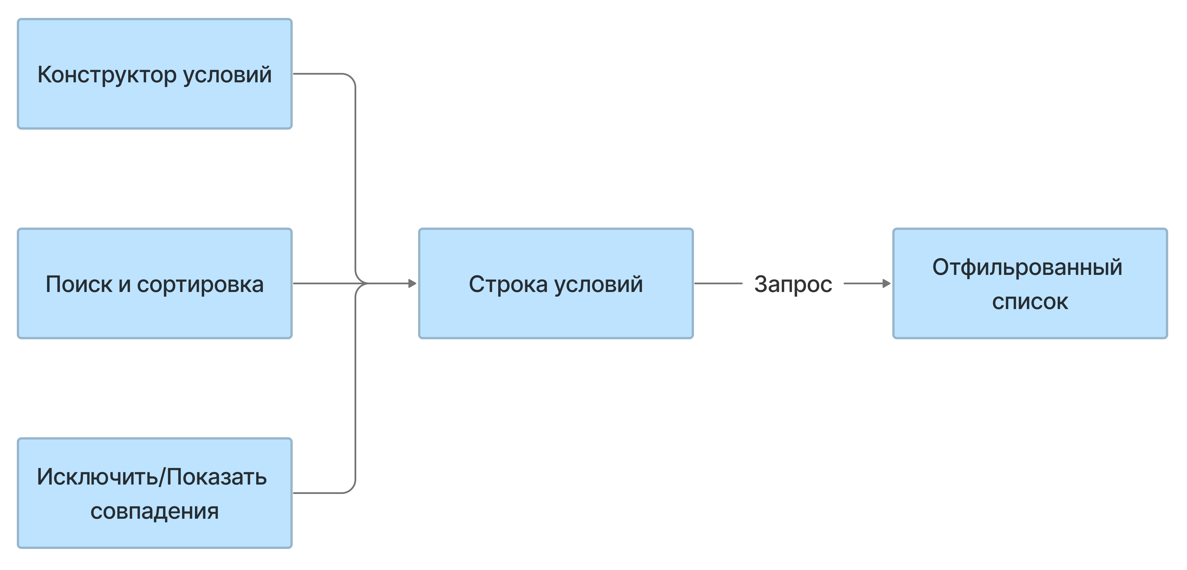 Все эти компоненты формируют строку условий, которая отправляется в качестве GET-параметра в запросе. А возвращается и отображается отфильтрованный список записей.