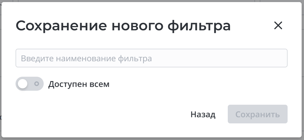 Нажмите Сохранить новый фильтр, чтобы открыть модальное окно, где нужно ввести уникальное наименование фильтра. Пользователь с ролью admin может определить, должен ли фильтр быть доступен другим пользователям или только ему: