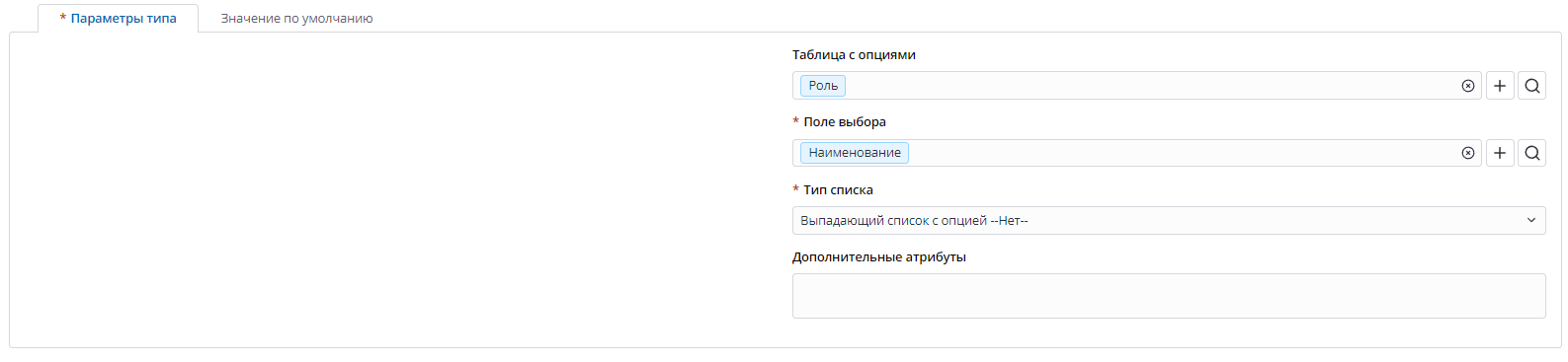 В третьем случае, доступные опции взяты из определенной колонки исходной таблицы. На примере ниже, таблица Роли содержит колонку Наименование. Опциями для выбора будут выступать все значения заполненных полей Наименования записей этой таблицы.