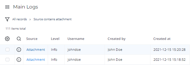 Система регистрирует все операции (кроме чтения) в таблице Основной журнал (sys_log). У операций, связанных с вложениями, значение поля Источник равно Attachment. Перейдите в Системный журналОсновной журнал.
