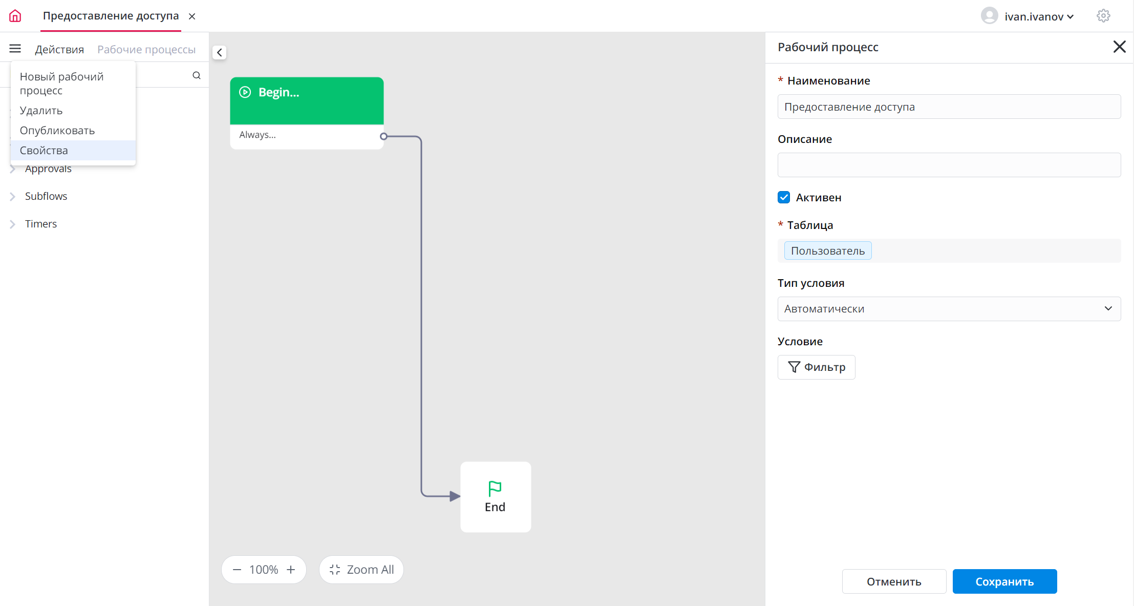 Рабочий процесс создан и готов к настройке. Вы можете добавлять действия, переходы и выходы, определять условия выходов и другое.