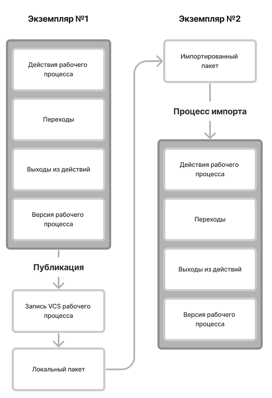 На схеме ниже представлен упрощенный процесс экспорта и импорта рабочего процесса. Подробнее об экспорте и импорте конфигурационных пакетов читайте в следующих статьях: