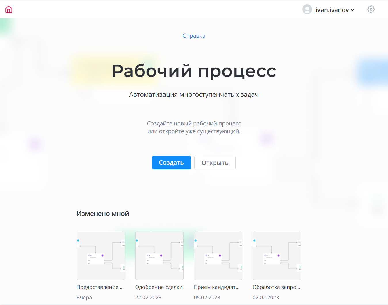 Откроется стартовая страница, на которой отображаются последние измененные рабочие процессы. Чтобы открыть рабочий процесс, нажмите Открыть. Чтобы создать новый процесс – Создать.