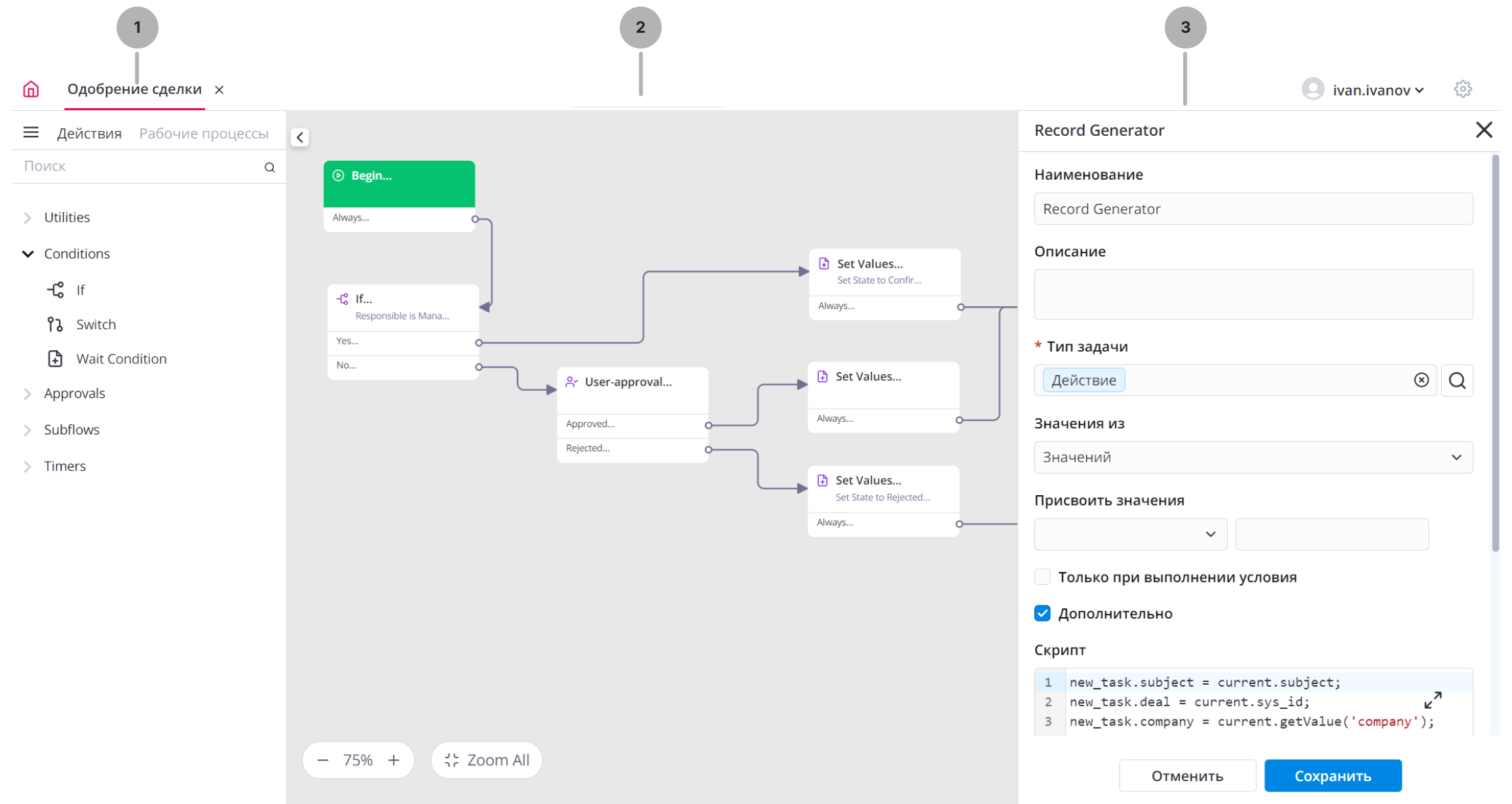 Рабочее пространство, где вы можете добавлять действия и настраивать переходы между ними.