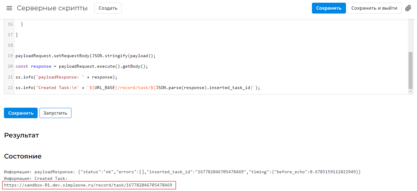 Внизу формы скрипта будет указана ссылка на созданную запись Задачи: