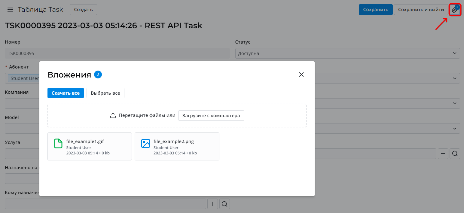 К созданной записи Задачи будет прикреплено 2 вложения – base64 файлы, переданные на 14 и 15 строках скрипта: