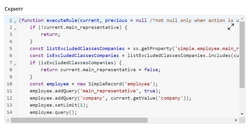 Разработка приложений и бизнес-логики на платформе SimpleOne подразумевает активное использование скриптов. Редактор скриптов – это инструмент интегрированной среды разработки. Он предлагает, например, подсветку синтаксиса, автодополнение, множественные курсоры. В полях типа Script на различных формах по всей системе используется CodeMirror – компонент JavaScript, предоставляющий возможность редактирования исходного кода в браузере. Подробнее читайте в документации CodeMirror.