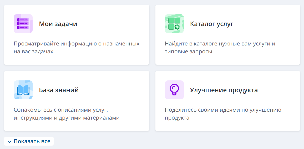 Портальный виджет Portal Cards предназначен для отображения ссылок на заданные страницы портала в виде карточек в соответствии с настроенными критериями доступа для каждой их них. Записи всех карточек, доступных для отображения в виджете хранятся в таблице Портальные карточки (portal_card). В записях этой таблицы вы можете задать отображаемый заголовок карточки, ее описание, указать изображение, которое будет добавлено на карточку, ссылку на страницу, на которую пользователь будет перенаправлен после клика, определить должна ли карточка быть отображена, а также порядок отображения карточек в виджете.