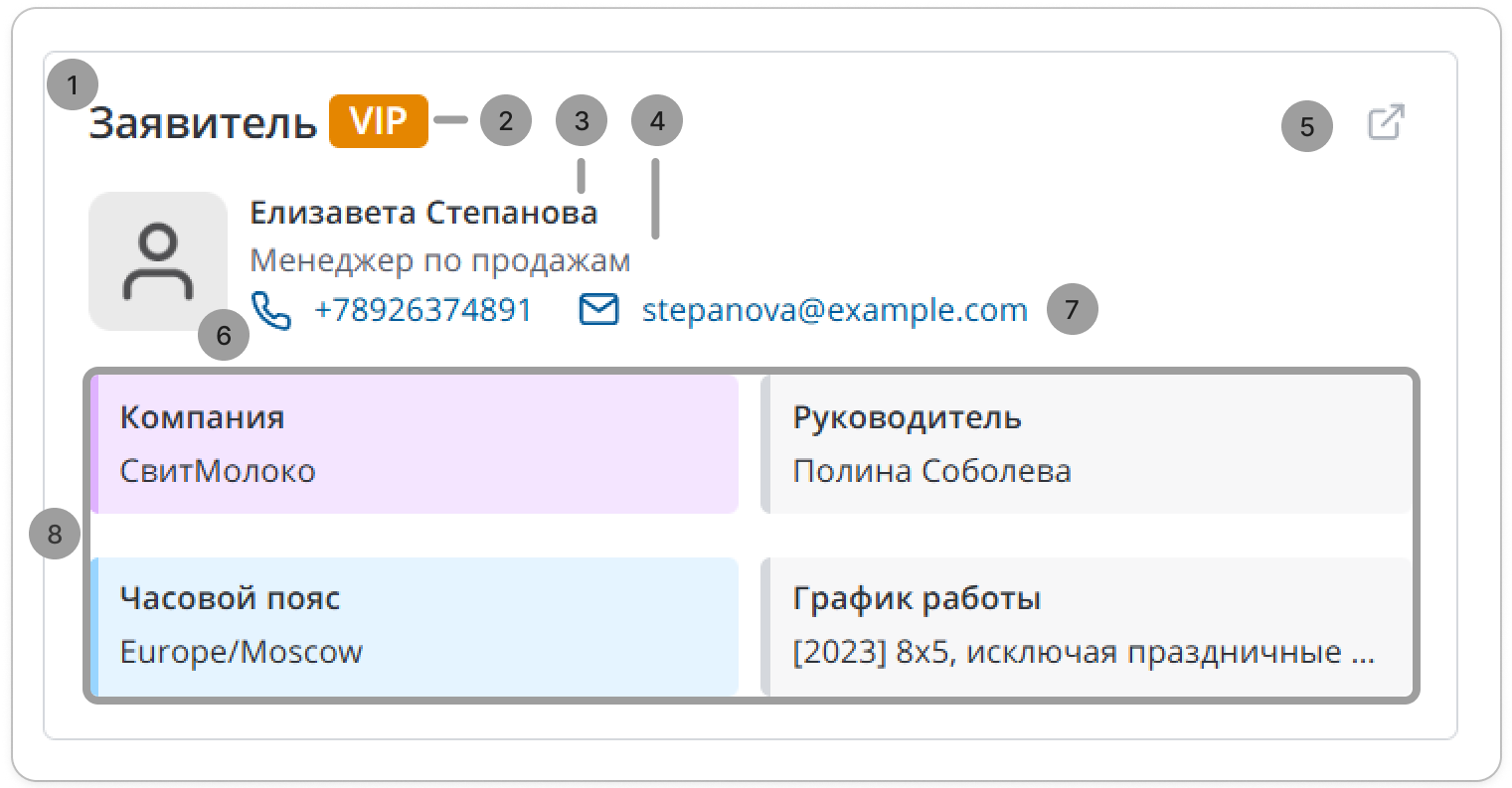 По умолчанию, этот виджет извлекает информацию о пользователе из записи, на которую ссылается поле Заявитель. При отсутствии данных или доступа к ним на форме виджета отображается соответствующая информация.