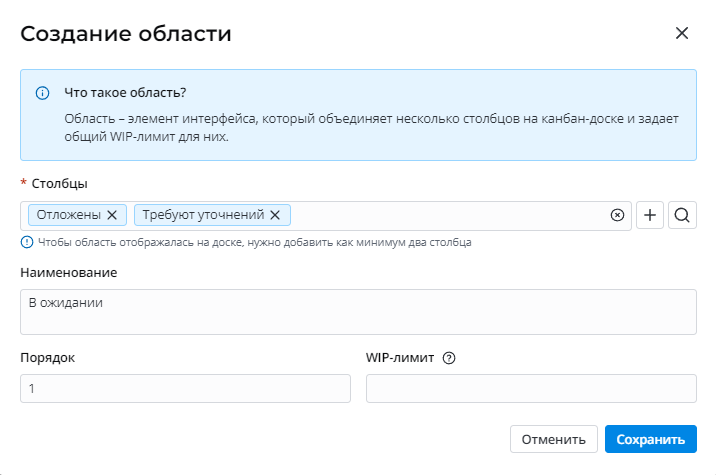 СтолбцыДаУкажите столбцы канбан-доски, которые будут объединены в одну область. В области должно быть как минимум два столбца.