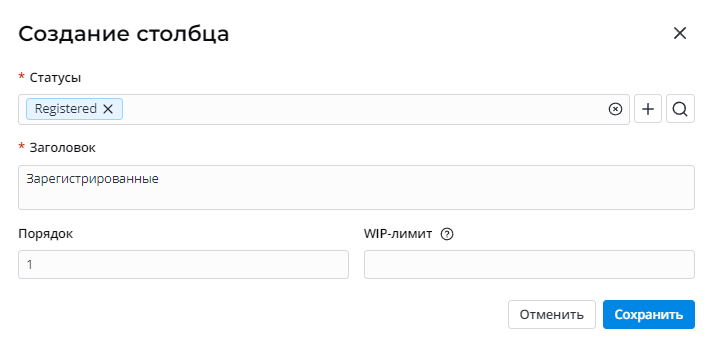 1. Нажмите Создать столбец на записи канбан-доски. Появится модальное окно.