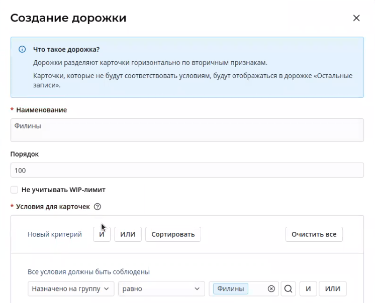 • По умолчанию существует дорожка Остальные записи. Она отображается на доске, когда есть карточки, которые не соответствуют условиям ни одной созданной дорожки.