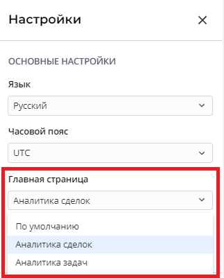 2. В поле Главная страница выберите дашборд, который вы хотите видеть в качестве основной страницы.