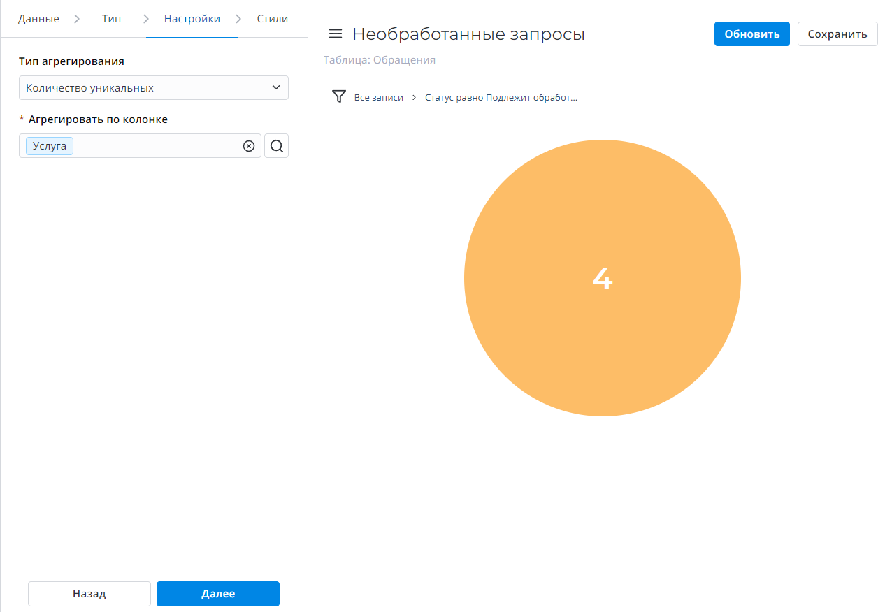 Выбранный тип применяется к колонке таблицы, указанной в поле Агрегировать по колонке.