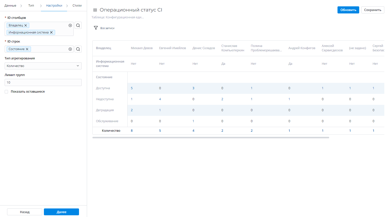 СтолбецДаВыберите колонку таблицы, которая будет использоваться как столбец для сводной таблицы отчета.