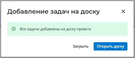 Нажмите Закрыть, чтобы закрыть модальное окно и остаться в виджете Пополнение доски, или Открыть доску, чтобы перейти на доску проекта.