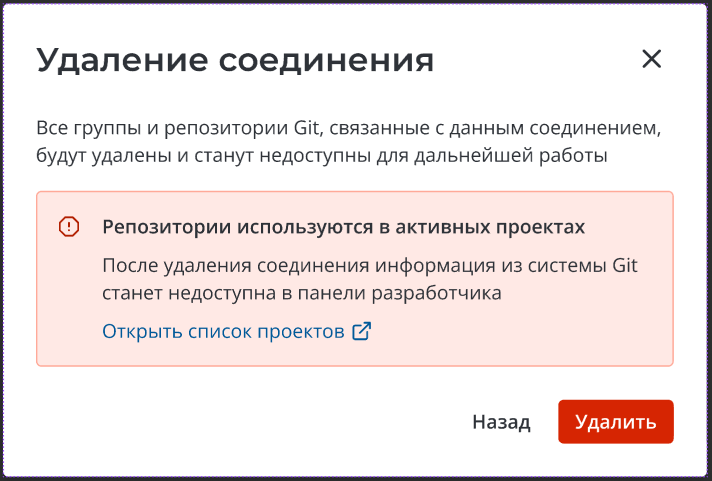 (опционально) Если репозитории выбранных соединений используются в активных проектах, вы можете ознакомиться с их списком перед удалением, нажав Открыть список проектов в открывшемся модальном окне.
